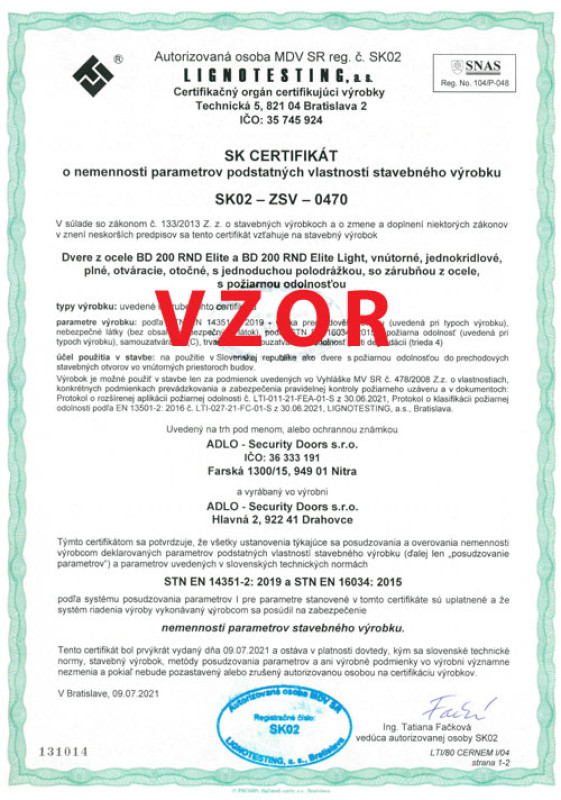 Protipožiarnosť pre ADLO dvere BD 200 RND Elite a Elite Light, 1. strana
