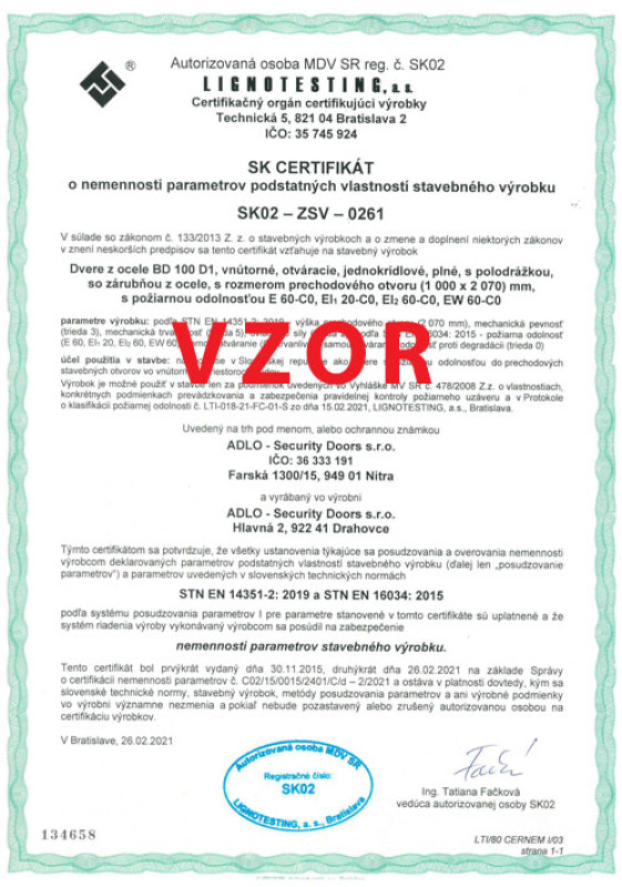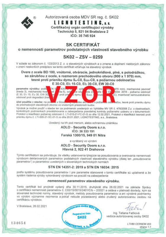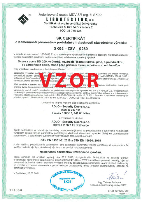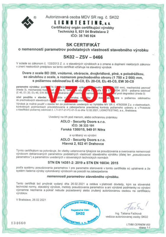 Protipožiarnosť pre ADLO dvere BD 200, 1. strana