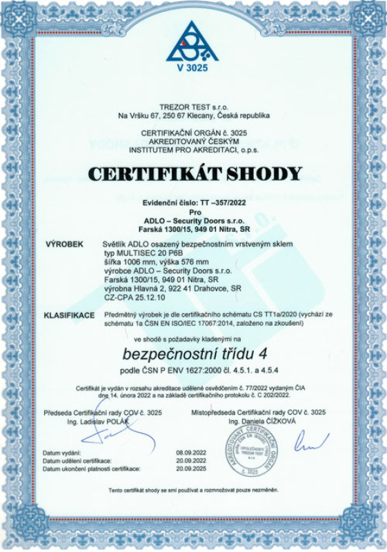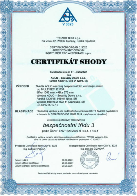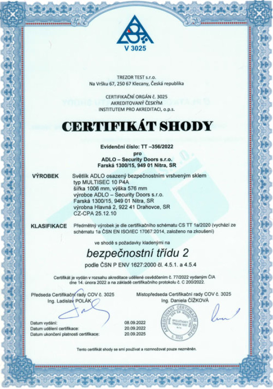 Certifikát Svetlíka ADLO v 3. bezpečnostnej triede