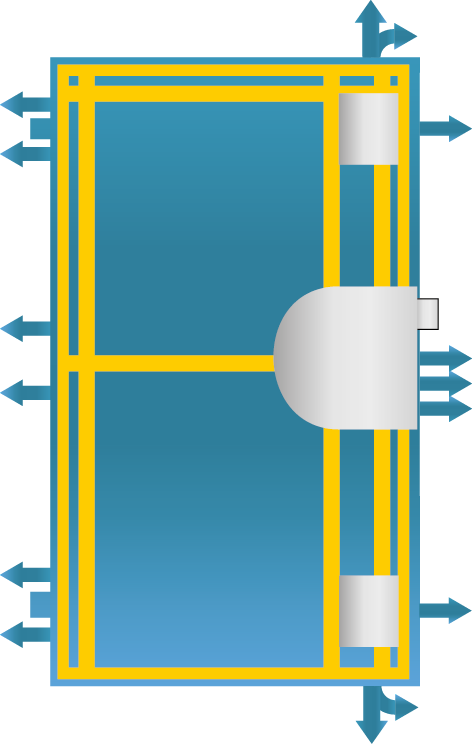 - Úplné oddelenie vnútornej a vonkajšej konštrukcie izolačnými platňami dokonale odstraňuje tepelné mosty. Aj pri mrazoch tak vnútorná strana dverí ostáva s teplotou príjemnou na dotyk.