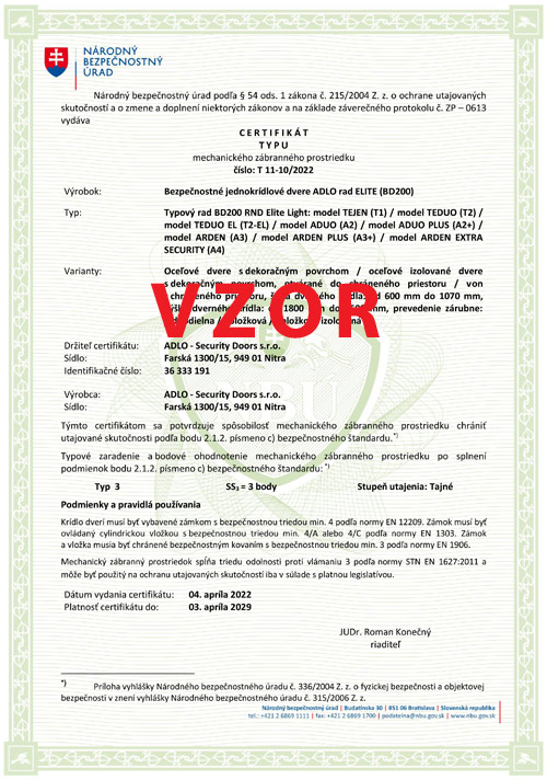 - osvedčenie NBÚ SR na stupeň utajenia "T" Tajné