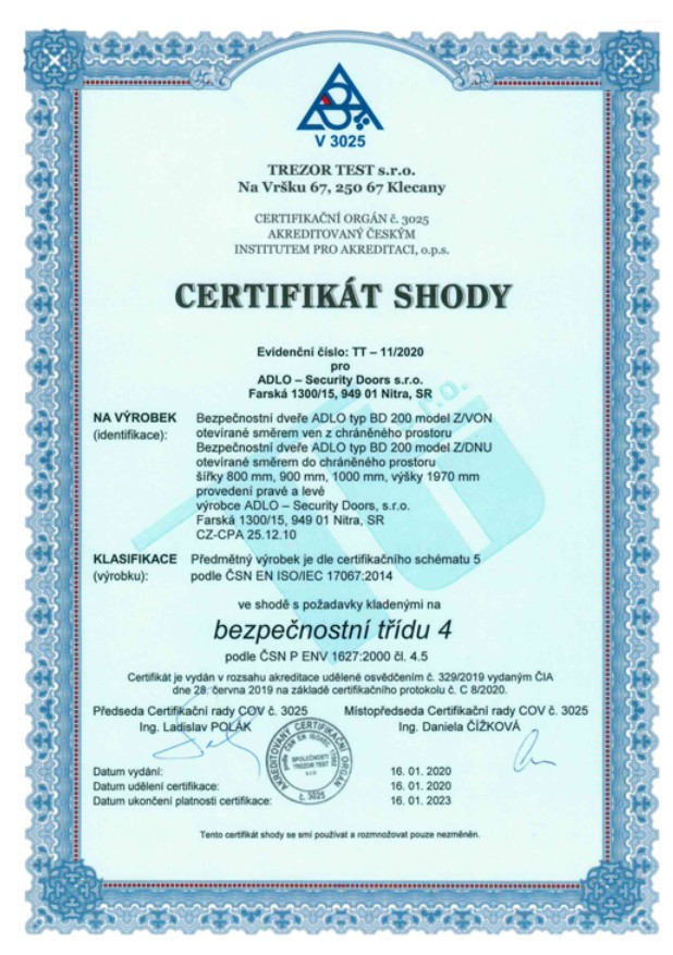 Certifikát na Bezpečnostné dvere: Bezpečnosť dverí BD200 ZENIT, ZENEX