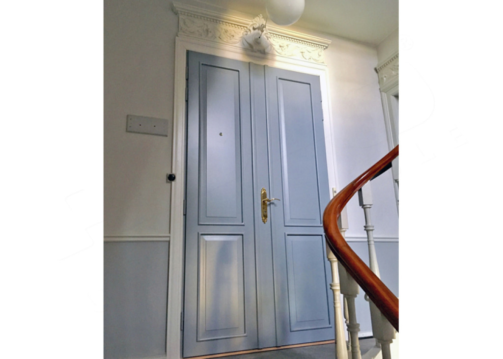 Dvojkrídlové ADLO - Bezpečnostné dvere ADUO, atyp kazetový design, RAL 6019, atyp obloženie zárubne