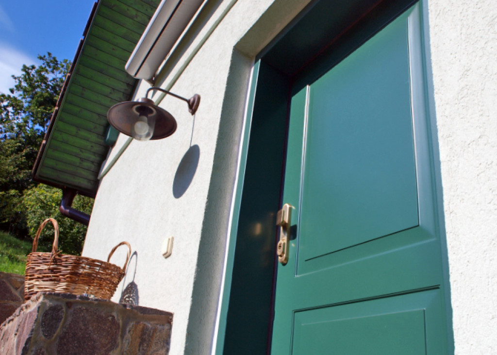 Exteriérové Termo dvere TEDUO, kazetový design 101 - KV 1, povrch dverí RAL 6028 mat